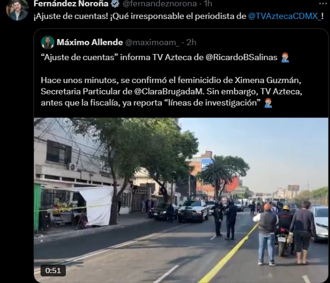 “¡Ajuste de cuentas! ¡Qué irresponsable el periodista de @TVAztecaCDMX_!”, escribió Noroña, acompañado del enlace al reportaje.
