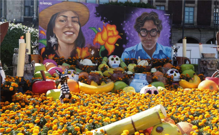 Desde la tradición: la ofrenda reúne elementos clásicos (cempasúchil, pan de muerto, alimentos, flores) en un altar monumental, lo que permite que capitalinos y turistas participen del ritual colectivo de memoria.
