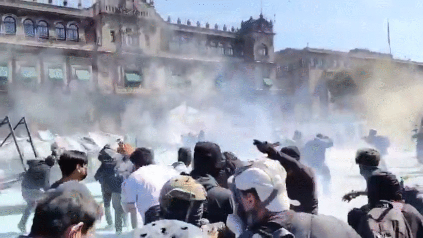 Alrededor de las 13:00 horas, al aproximarse al Zócalo, un grupo minoritario conocido como «bloque negro» –encapuchados vestidos de negro– intentó derribar las vallas metálicas de tres metros instaladas frente a Palacio Nacional. Usaron martillos, barretas y esmeriles para forzar las barreras, mientras algunos trepaban y lanzaban cohetes hacia los elementos policiacos. La mayoría de los manifestantes se desmarcó de estas acciones, gritando «No a la violencia» para preservar el carácter pacífico de la protesta.